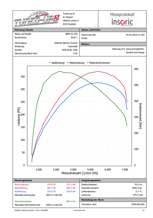 BMW X3 335i Stufe 1 auf 370 PS / 584 NM nach EWG 80/1269